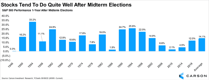 Stocks historically haven’t done very well the first few quarters of a midterm year, but they do quite well once the midterm election is over. In fact, since World War II, the S&P 500 has been higher a year after the midterm election every single time, up 14.1% on average. Much better times could be coming and soon.