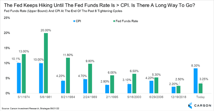 Looking back at the previous eight rate hike cycles shows that the Fed hikes until rates get above the headline CPI number. With inflation still running at 8.3% and rates at 3.25%, more hikes could be in the cards. And the Fed’s latest projections suggest we’ll see at least another 125–150 basis points of rate hikes.