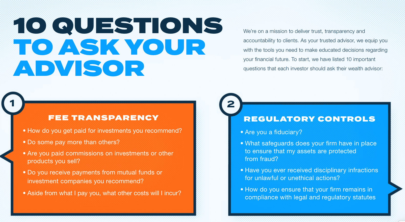 We’re on a mission to deliver trust, transparency and accountability to clients. As your trusted advisor, we equip you with the tools you need to make educated decisions regarding your financial future. To start, we have listed 10 Important Questions That Each Investor Should Ask Their Wealth Advisor.