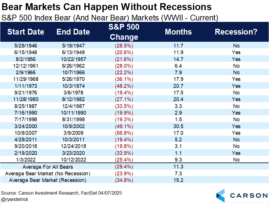 Still, looking at the past 18 bear (or near bear) markets, we find that nine took place in a recession and nine didn’t, with the average bear down nearly 30% over those 18 times. The times a recession was avoided, stocks fell about 24%, compared with bears in a recession down nearly 35%. (But keep in mind that doesn’t include the times a recession didn’t see a bear market, which also happens.)