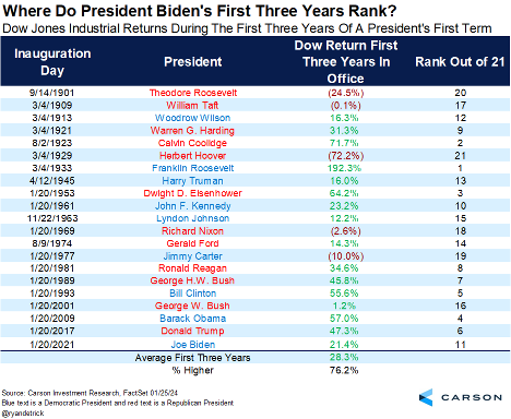 How have stocks done under President Biden? Don’t shoot the messenger here, but the Dow was up 21.4% his first three years in office, which ranks 11th out of the past 21 Presidents using Dow data back to 1900.