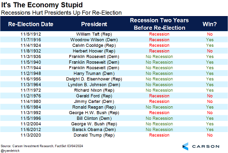 How investors feel going to the polls always matters, as we’ve found that if there was a recession in the two years before an election then a president up for reelection usually loses. And if there was no recession, they would usually win. In fact, this has worked every time since former President Calvin Coolidge way back in 1924, who was reelected despite a recession in the previous two years. But then Coolidge had only become president in August 1923 when former President Warren Harding died unexpectedly, and the economy was already rebounding at that point.