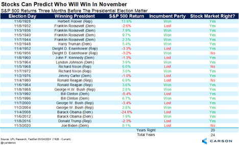 Lastly, how stocks do the three months before an election also has some predictive ability. If stocks are up, the incumbent party usually wins and if they are down, the incumbent party usually loses. This didn’t work in 2020, but it has worked 20 out of the last 24 elections.