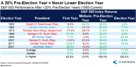 Another angle on this is after a 20% gain in a pre-election year, we’ve had a higher election year the past seven times going back to 1950. Also, look at how normal it is to have red in a midterm year, then a big bounce the following year. If this tendency continues to play out, it’ll be more good news for 2024.