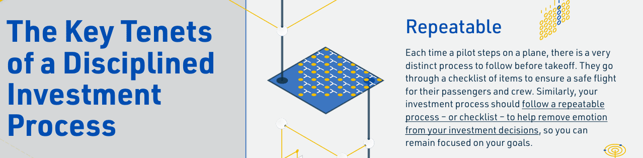 As the markets go up and down, it can be challenging to keep your emotions in check if you are not following a defined, repeatable process. The key is to stay true to your process rather than chasing fads. These key tenants can help you follow a disciplined investment process and remove emotional decisions to help you stick to your long-term objectives.