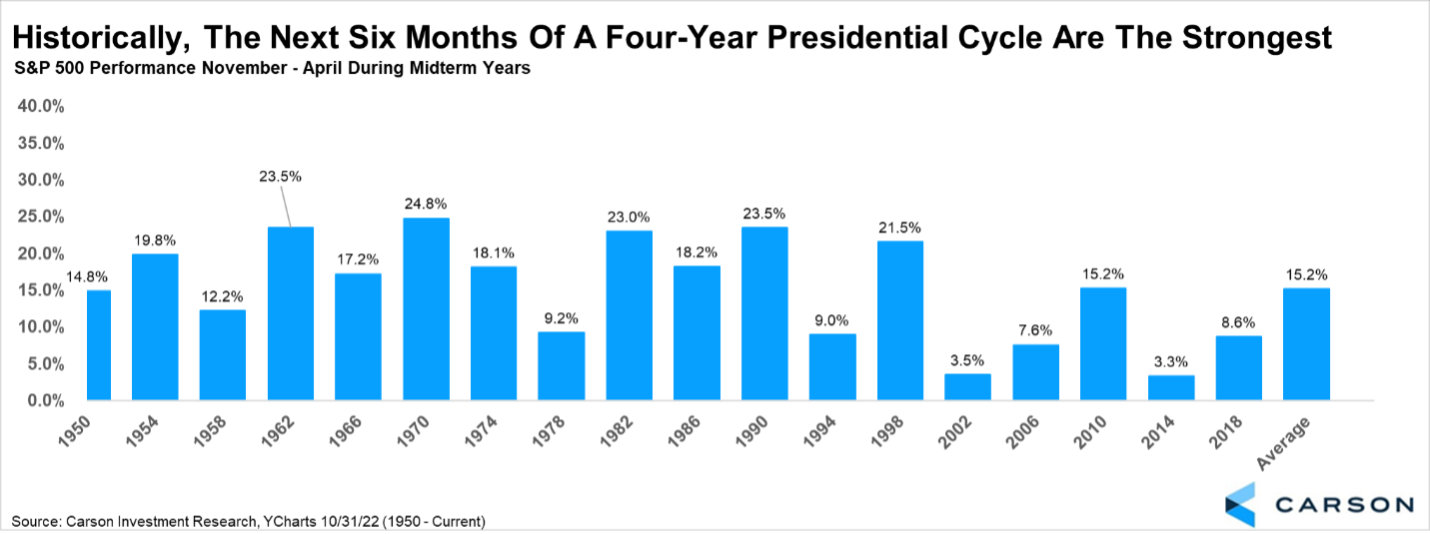 One of our favorite tables we’ve shared this year is right here. The first few quarters of a midterm year tend to be quite weak when looking at a 4-year presidential cycle, which played out all too well this year. The really good news is some of the best quarters are upon us, so don’t lose faith quite yet.