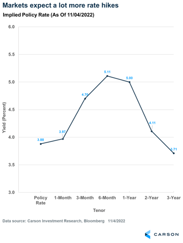 However, none of this was new news. Fed members projected the terminal rate to be around 4.6% at their September meeting, and markets were quick to price that. Then, in mid-October, a hot inflation report sent expectations even higher. Expectations for the terminal rate crept up to above 5% prior to last week’s meeting, and they haven’t moved much since then, even after Powell’s comments. Investors are clearly ahead of the Fed now, as they expect updated terminal rate projections at the Fed’s December meeting to come in around 5-5.2%. All in all, we’re probably looking at another 1-1.25% worth of rate increases over the next four to six months. But the Fed may very well slow the pace down, perhaps raising rates by “only” 0.5% at its December meeting.