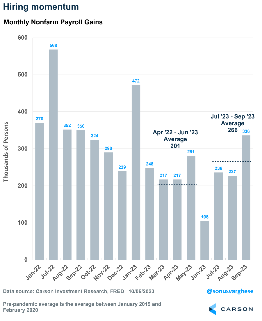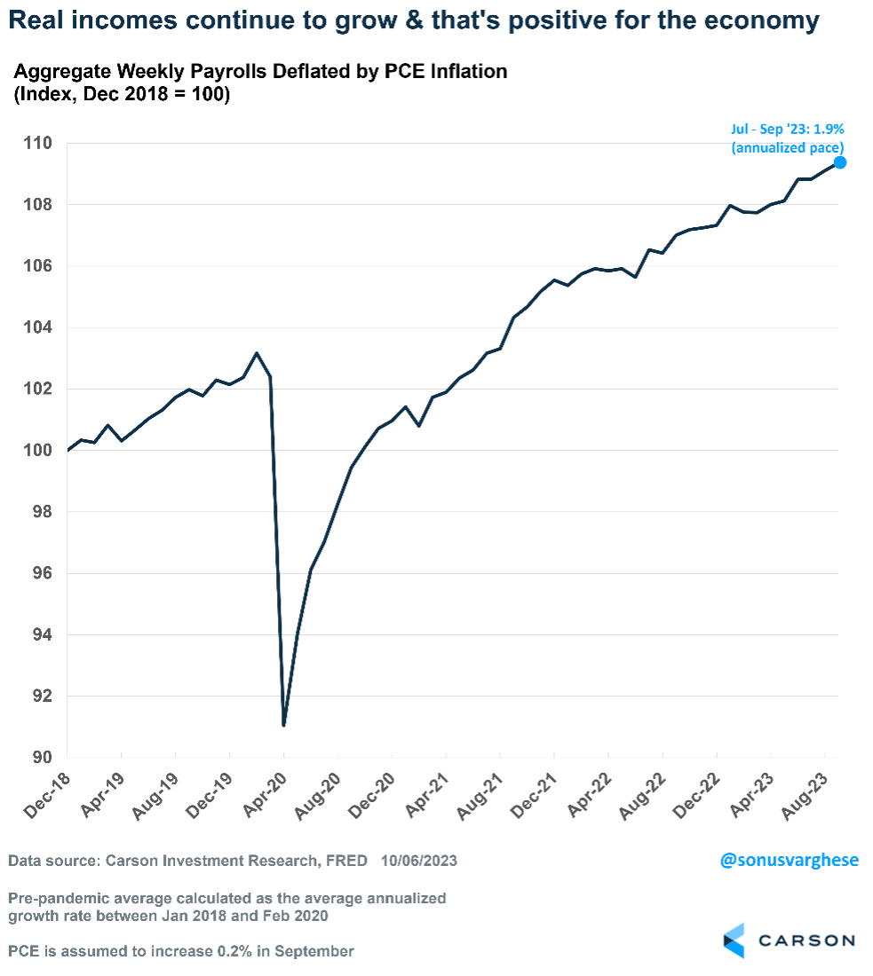In short, the economy has strong momentum going into the fourth quarter, especially amid myriad concerns, all of which we have written about (strikes, student loan payment restart, government shutdown). The unemployment rate was steady at 3.8%, but that’s well below historical levels.