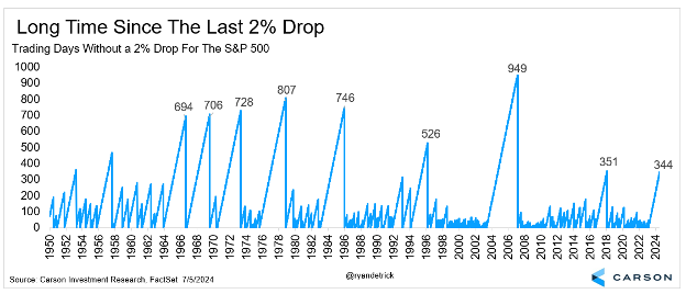 Not to be outdone, the S&P 500 hasn’t had a 2% daily decline for a very, very long time. In fact, the last time it fell 2% or more in one day was way back in February 2023! Although this could suggest we are long in the tooth for some volatility, look at this chart we made that showed there have been some streaks that have actually lasted much longer.\