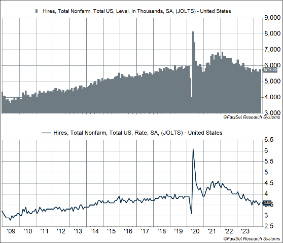 The payroll growth numbers quoted above are “net employment numbers,” i.e. overall hiring net of separations, whether voluntary (people quitting jobs) or involuntary (layoffs). Breaking it down, overall hiring has eased. It’s now running around 5.8 million, which matches the 2019 average. However, the labor force is much larger, and hiring as a percent of overall employment is currently at 3.6%. That’s below the 2019 average of 3.9% and matches what we saw all the way back in 2014. Not exactly weak (the hiring rate collapsed below 3% during the 2008-2009 recession), but not too hot either. In other words, it isn’t easy to find a job if you’re looking for one right now, a very different situation from what we saw in 2021/2022 through early 2023.