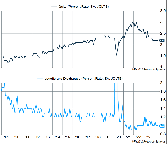 What’s likely happening is that companies did a lot of hiring in 2021/2022 (maybe too much) and are now easing up. If companies were truly pessimistic about sales and profits, they would be letting more people go. One positive aspect of this is that workers who stay in their jobs longer get more productive.