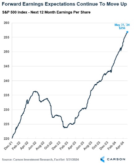 And what’s the earnings picture been? Year-ahead earnings expectations have steadily advanced this year. Ultimately, that’s what you need to support stock gains. Earnings expectations can be slow to react sometimes, but right now analysts aren’t seeing anything that would lead them to shift expectations. If the earnings momentum continues, we should see additional gains for stocks over the rest of the year.