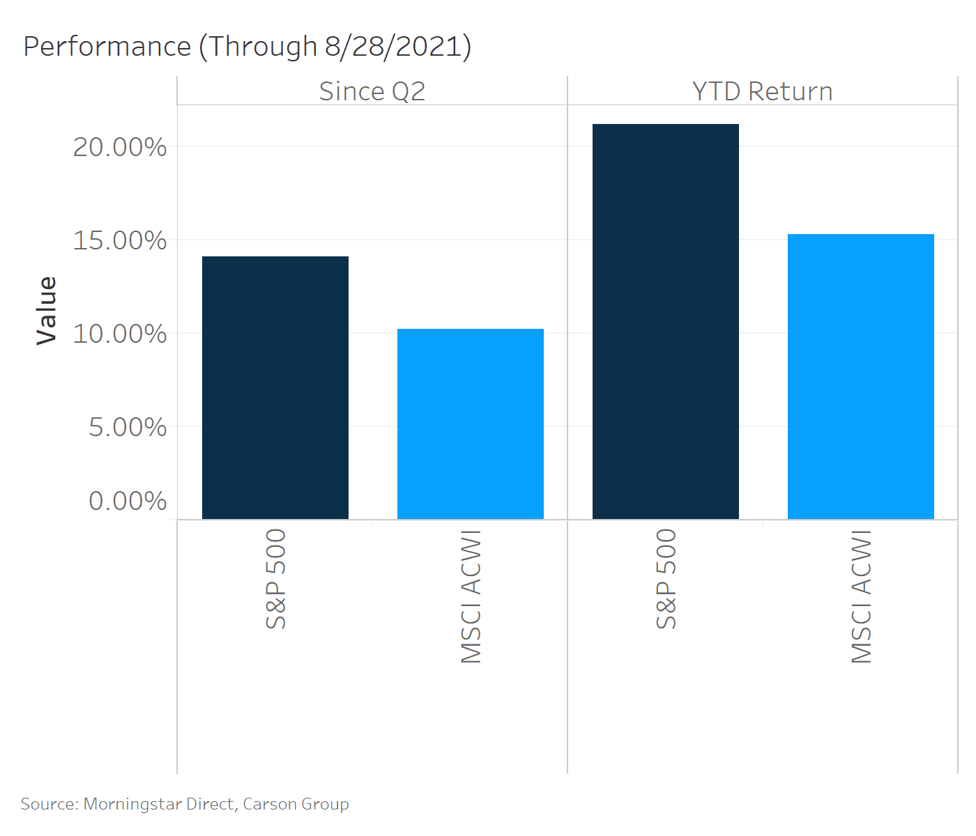 When the S&P 500 is the dominant market performer, some investors start questioning how well their portfolio is performing even when its results remain solid compared to the global index. This year, the S&P 500 has gained more than 20%, while global stocks have climbed only 15.3%. But global stocks include the U.S. When the U.S. is stripped out, the MSCI ACWI ex U.S. has only increased 8.3% this year (Figure 1). Much of the poor international performance comes from China and its decision to tighten information sharing to the detriment of Chinese social media companies. The MSCI China Index has dropped 15.1% this year. These comparisons can also be more difficult when portfolios include bonds. The Bloomberg U.S. Aggregate Bond Index is down 0.7%, and that causes performance to drop more quickly as risk declines.