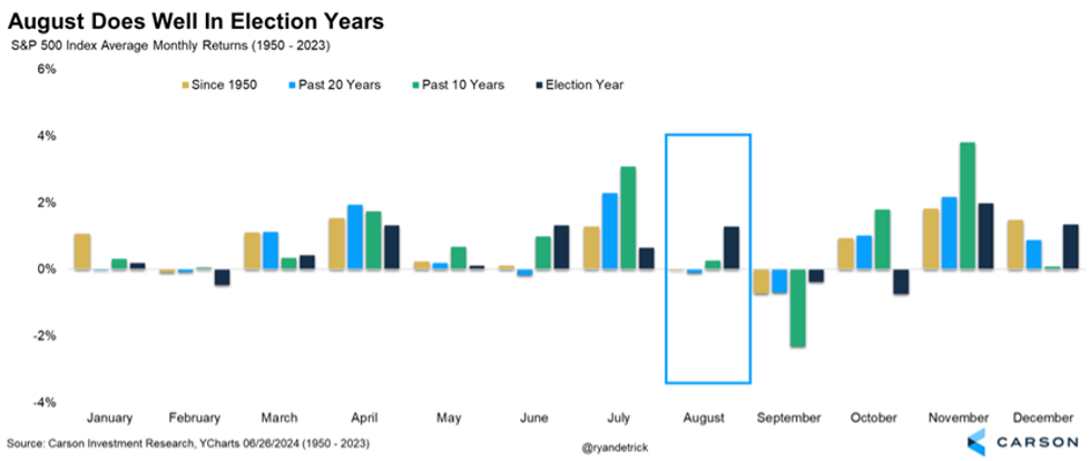 This has been one of the worst first two days to a month ever, but all hope is not lost. August is known for volatility and rough sledding. The S&P 500 has averaged a negative month in August since 1950 as well as over the past 10 years, something only February and September can match. But here’s the catch, and there’s always a catch. Stocks have historically done quite well in election years in August.