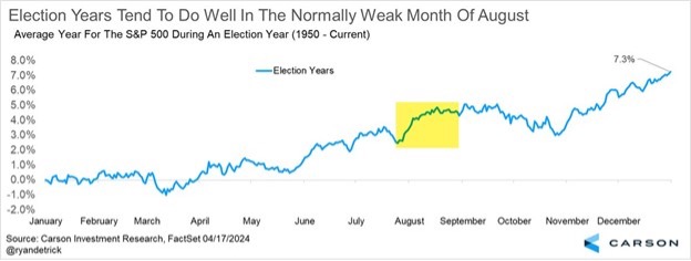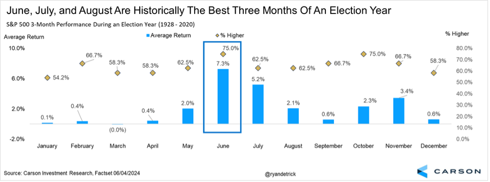 Here’s a chart we’ve shared a lot lately and it was one reason we expected a surprise summer rally when so many were telling us the yield curve and LEIs were reasons to be bearish, a narrative that is now several years old. The bottom line is June, July, and August are historically the best three months for investors in an election year and this year has again rewarded them so far.