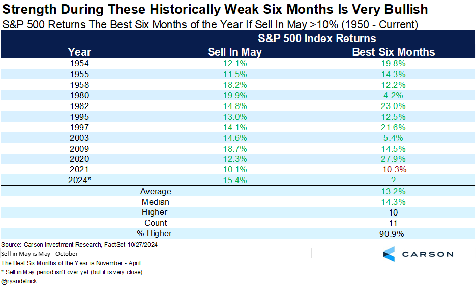 But what happens when the ‘Sell in May’ period is strong? After all, this time around stocks have gained more than 15% during this usually weak six-month stretch, one of the best gains over this period ever. We found 11 other times the S&P 500 gained double digits from May through October and the next six months … it did even better, gaining 10 times and climbing 13.2% on average, well above the 7.1% average seen in all years.