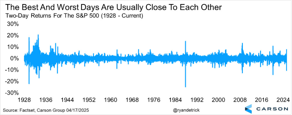 As we’ve noted recently, the best and the worst days tend to happen very close to each other. In fact, on Thursday, April 10 and Friday, April 11, the S&P 500 fell more than 10% for one of the worst two-day returns in history. Many investors couldn’t take it and after that historic selling decided to get out of stocks early that next week. Sure enough, a historic jump was right around the corner, with now one of the best two-day rallies ever. As the chart below shows, the best two-day rallies and declines tend to happen near each other, with the worst days usually happening first, often followed by a huge rebound. This is another reminder that volatility is the price we pay to invest, and if you want to experience the big rallies, you will have to withstand the sell-offs.