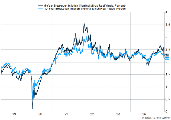 Currently, inflation expectations, as measured by breakeven inflation (the difference between nominal yields and real yields taken from TIPS securities), are consistent with the Fed’s 2% target. 5-year breakevens are at 2.3% and 10-year breakevens are below 2.2%. Note that these track CPI, which tends to run 0.3 – 0.4%-points below the Fed’s preferred PCE metric. These metrics suggest markets believe the Fed can and will bring inflation under control. (This could also mean higher rates in the future.)