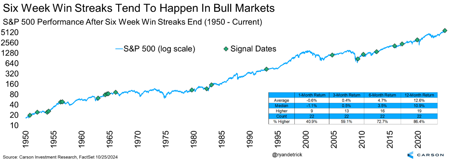 Still, the S&P 500 is up nearly 22% on the year. If the year ended right now that would be the best election year return since a 25% gain way back in 1980. Some additional election volatility is still possible, of course. The good news is long weekly win streaks tend to happen in bull markets, which is another reason we would not panic should more near-term pain take place. Since 1950, we found there were 22 other times the S&P 500 had a six-week win streak (meaning stocks were lower the seventh week) and it was higher a year later 19 times and up a solid 12.6% on average. Yes, the returns over the next month were negative, but after long winning streaks this shouldn’t be very surprising.