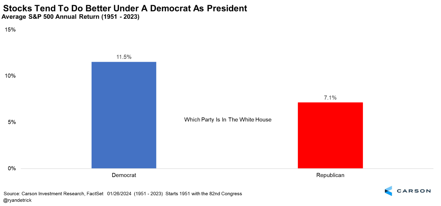 What we said then: “Another popular question is how stocks do based on which party is in the White House. Now is when people might want to throw something at me, but it is what it is. Historically, stocks have done better with a Democratic president versus a Republican in power. As with many of these numbers, we would take this with a grain of salt. Despite the tendency to view the president as responsible for the economy, the president alone often has a relatively small impact compared to broader economic forces. Do you think the fact that 10 of the last 11 recessions started under a Republican president is because a Republican was in the White House? We don’t.”