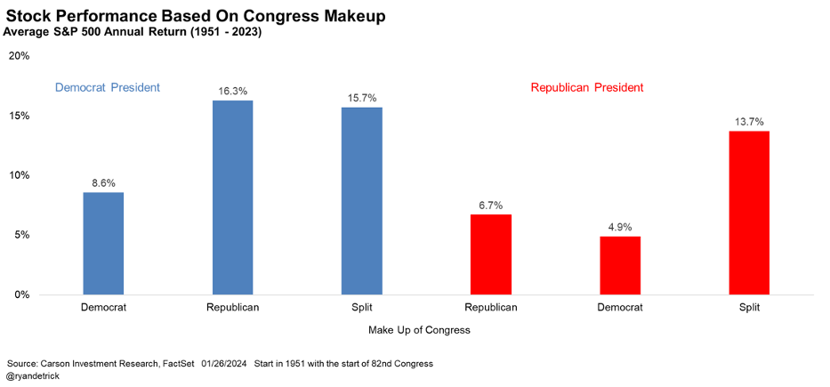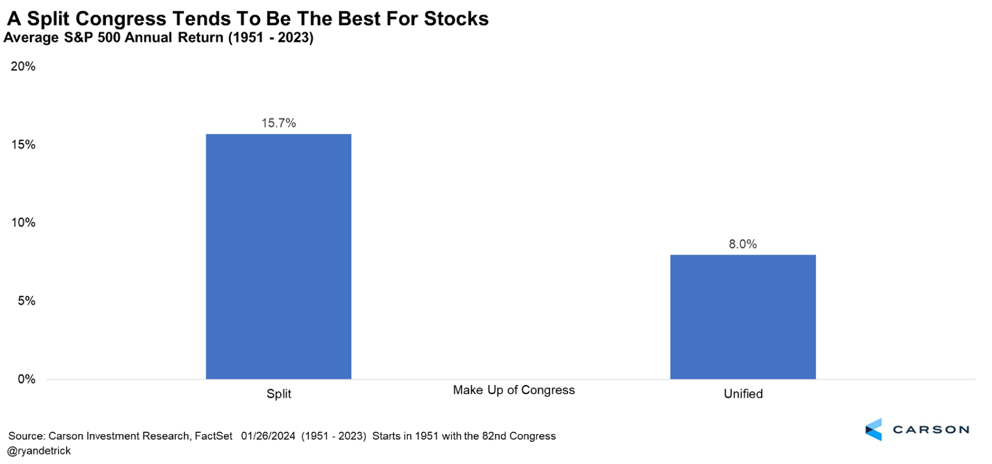 What has happened: Looking at 2024, we do have a split Congress (Democratic Senate and Republican Congress) along with a Democratic president. Historically that has been a policy friendly mix, and I think it’s fair to say that applies to 2023 and 2024. A narrow Democratic majority in the Senate and narrow Republican majority in the House limited fiscal excesses while allowing some bipartisan legislation to progress. We discuss above why some of the features that make divided government market friendly will likely still be present in 2025, even if we see a sweep.