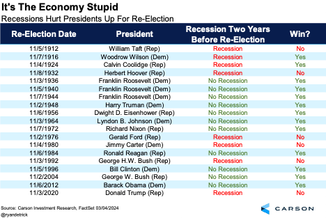 What we said then: “How investors feel going to the polls always matters, as we’ve found that if there was a recession in the two years before an election then a president up for reelection usually loses. And if there was no recession, they would usually win. In fact, this has worked every time since Calvin Coolidge way back in 1924, who was reelected despite a recession in the previous two years. But then Coolidge had only become president in August 1923 when President Warren Harding died unexpectedly, and the economy was already rebounding at that point.”