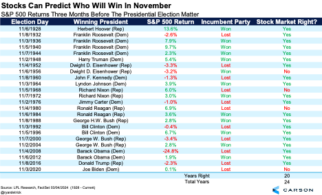 What we said then: “Lastly, how stocks do the three months before an election also has some predictive ability. If stocks are up, the incumbent party usually wins and if they are down, the incumbent party usually loses. This didn’t work in 2020, but it has worked 20 out of the last 24 elections.”