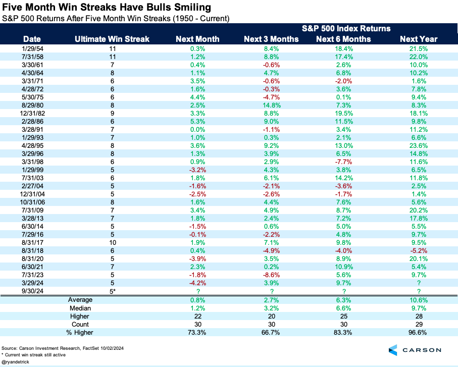 October isn’t quite over yet and there’s a chance stocks could finish higher for the sixth month in a row and eleventh time out of the past twelve months. It turns out when stocks gain five months in a row, they are higher a year later 28 out of 29 times, with a gain of more than 10% on average.