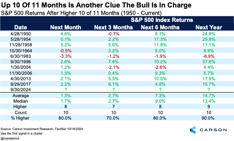 Lastly, when stocks gain ten of eleven months (like now) they are higher a year later nine out of ten times and up nearly 15% on average. In other words, this blast of strength we’ve seen isn’t a reason to turn bearish. In fact, it might be a reason to remain in the “glass half full” camp as we head into 2025.