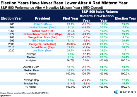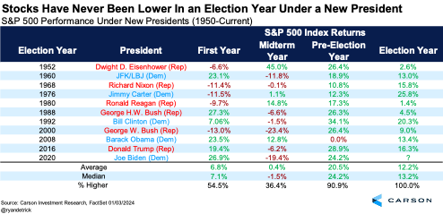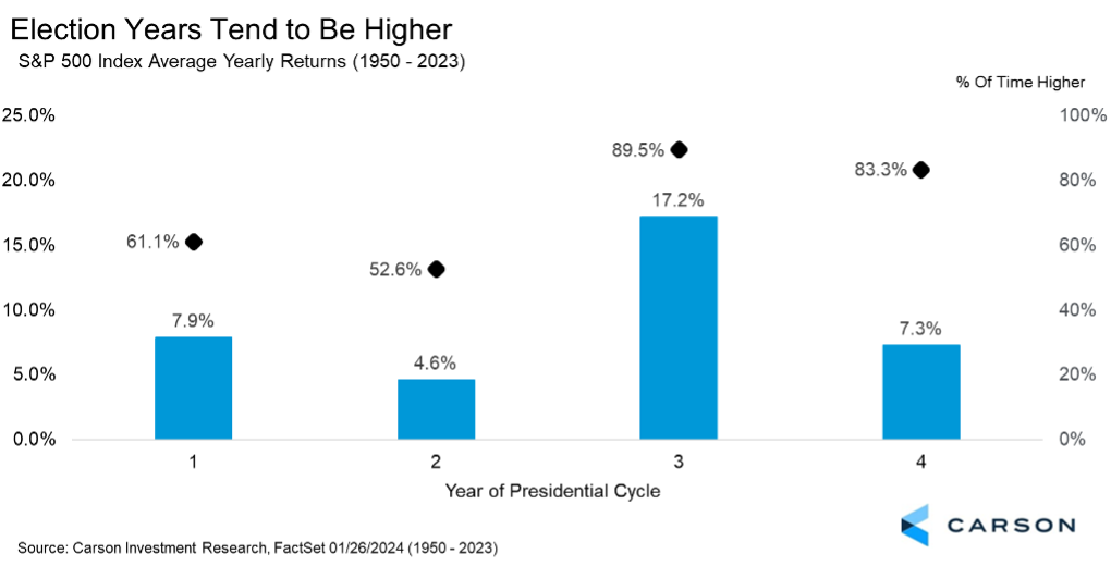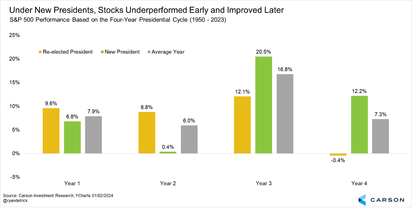 What we said then: “Historically, stocks have done much better in a pre-election year under a president in their first term (up more than 20% on average), while midterm years for a new president do much worse (virtually flat). That played out this time, with stocks down big in 2022 and bouncing back big in 2023. What matters now is election years, which have seen stocks do much better when a president is up for reelection versus a lame duck president.”