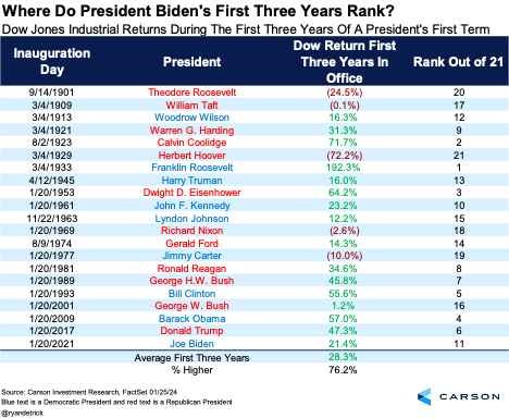 What we said then: “How have stocks done under President Biden? Don’t shoot the messenger here, but the Dow was up 21.4% his first three years in office, which ranks 11th out of the past 21 Presidents using Dow data back to 1900.”