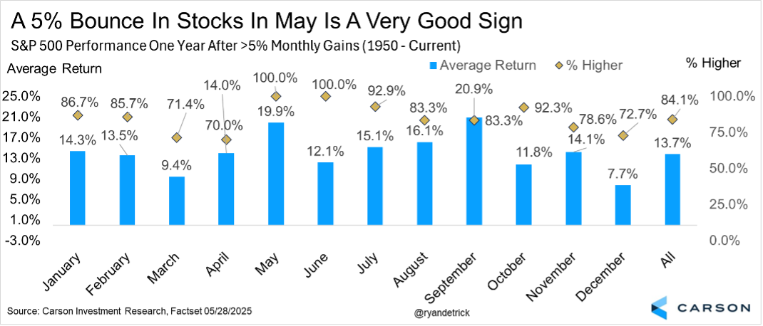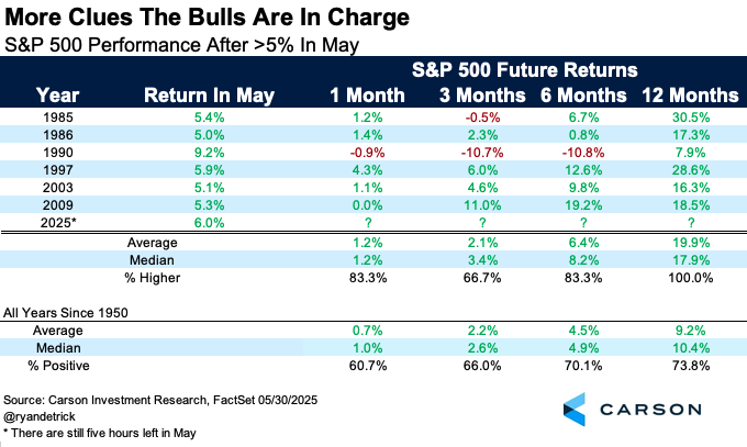 Here are the six times the S&P 500 gained at least 5% in May and what happened next. You can see stronger returns across the board and a year later up double digits five of six times. Not bad. A 5% gain in May also improves the picture for the historically weak month of June. After a big May gain, June is higher five out of six times and up 1.2% versus an average June return of 0.7%.