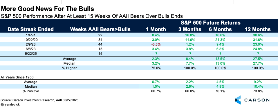 Just one such example: After 15 consecutive weeks, the AAII Sentiment Survey finally had more bulls than bears last week. We looked at what happened after previous long streaks ended and the good news is the bulls remained in control. This is a fun one, as seven of eight times saw stocks up at least double digits. The one time it didn’t work? Yep, 2008 and a total market crash. So there is something for everyone here, but we don’t see any reason to see a once in a lifetime crisis this time around and we’d file this under the ‘reasons to remain bullish’ category.