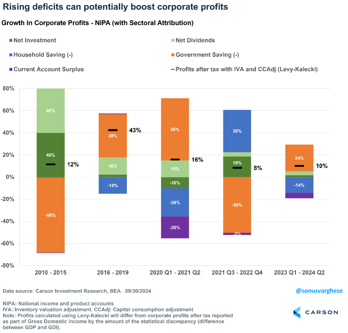 All this to say, the risks of a higher corporate tax rate (Harris) or tariffs (Trump) could be countered by rising fiscal deficits, resulting in a net boost to profits. That’s potentially positive for markets.