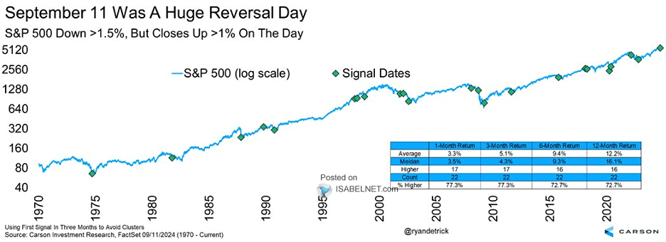 We found 22 other times since 1970 the S&P 500 was down at least 1.5% intraday but up more than 1% at close. A year later the index was up a median of more than 16%, with the near-term returns above average as well.