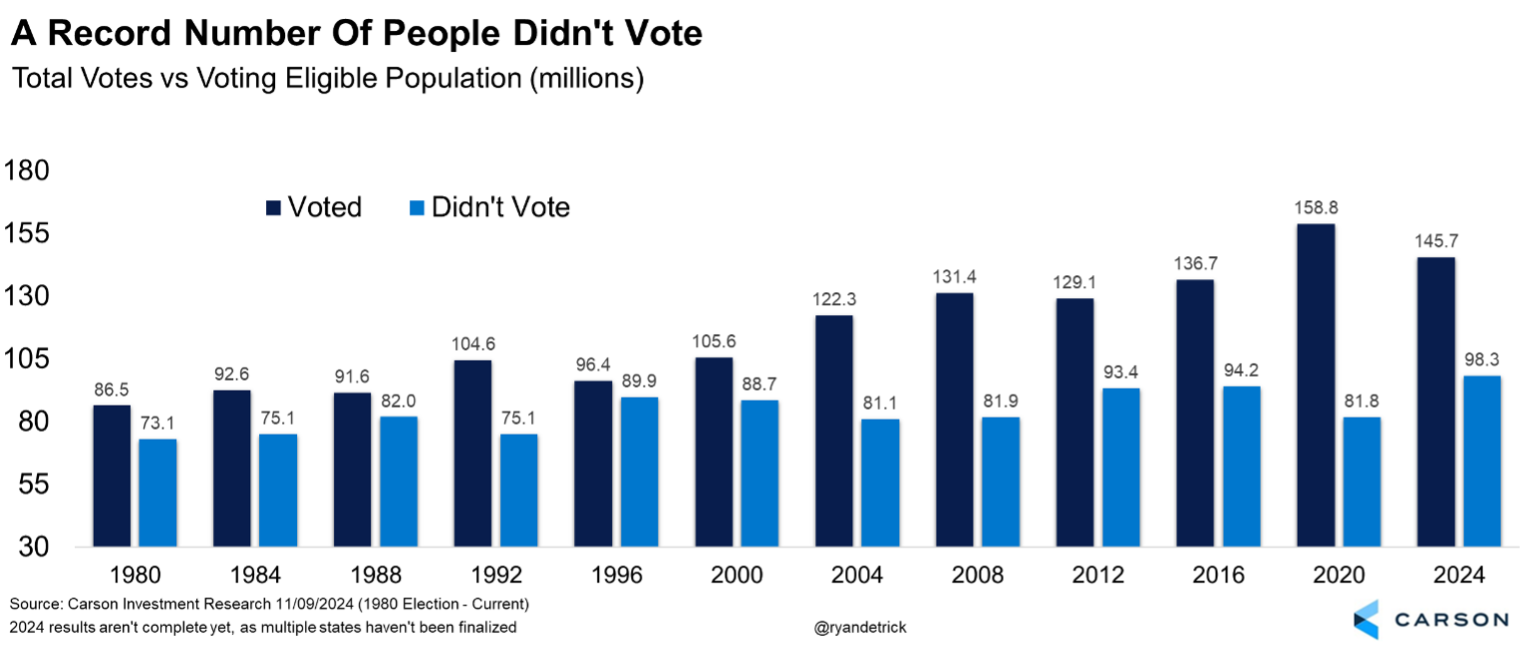 Although the numbers aren’t final yet (as some states continue to count votes), it is looking like a record number of people who were eligible to vote chose not to, with more than 98 million not voting in the 2024 election. This is up from just over 82 million four years ago. In fact, we saw a record number of nearly 159 million people vote four years ago, but this dropped nearly 13 million in total, the largest such drop ever. One of our greatest privileges in our country is our power to vote, let’s not forget that.