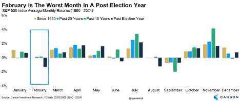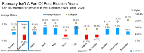 There are a few reasons February may be a rough month after an election. Maybe there’s a post-election honeymoon period after the election from November – January, but then February comes and reality hits. Or maybe it’s around February when the more bi-partisan tone candidates often strike during an election starts to revert to a more partisan tone after taking office. Or maybe presidents want to get more ambitious but controversial policies out early. Whatever the exact reason, the S&P 500 has been down 1.3% on average in February in post-election years and whether it is higher has been a coinflip, so some volatility or weakness now shouldn’t be a surprise.
