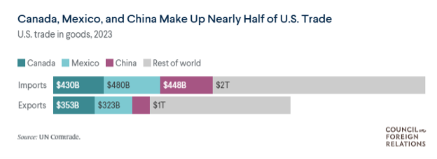 These tariffs, assuming they are imposed, are significant. Even if it doesn’t happen, the cloud of uncertainty is something businesses will have to deal with. If it does happen, that would be quite a massive shock — much larger than all the trade actions taken in Trump’s first term. Canada, China, and Mexico make up about 43% of US goods imports, and about 41% of US export destinations, as this chart from the Council of Foreign Relations (CFR) illustrates.