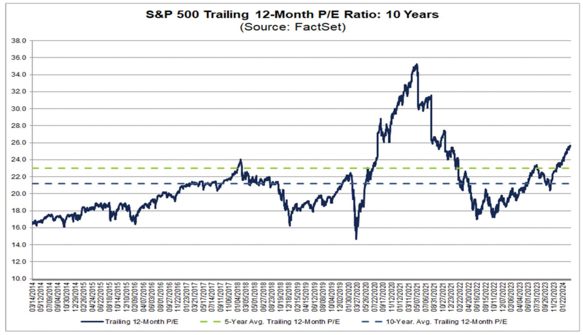 The trailing 12-month p/e ratio for the S&P 500 is about 26 versus the five-year average of 23 and the 10-year average of 21. Stocks are a bit pricey, but by no means are they historically out of line. If tech is removed from the equation, those numbers are estimated to drop approximately three points, putting stocks right in line with historical averages.