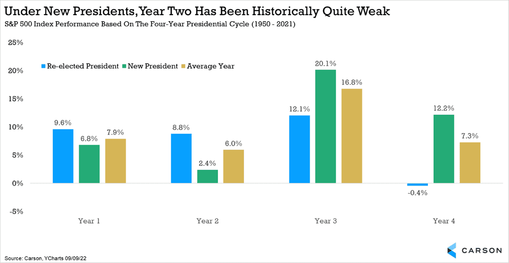 Midterm election years are known for big stock market drops and weakness for most of the year, generally until late-year rallies. So far, that sounds a lot like 2022. Since 1950, the S&P 500 has corrected peak-to-trough more than 17% on average during the year. Out of the four-year presidential election cycle, midterm years typically see the largest corrections. Why? During his or her first year in office, a new president mostly enjoys a relatively smooth ride. It isn’t until the next year that bumps arrive. Toss in the uncertainty of the midterm elections (markets hate uncertainty) and conditions are ripe for trouble.
