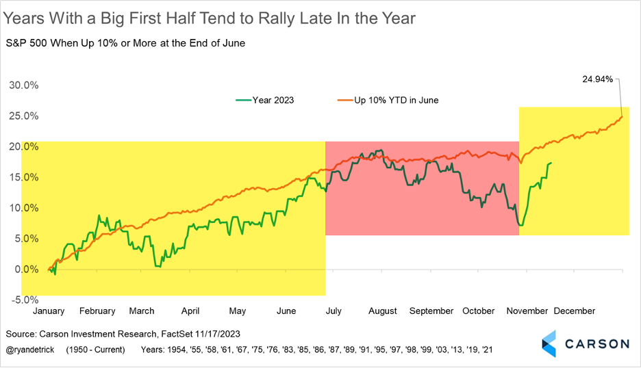 Previous years with big first-half gains have also tended to see weakness (or at least consolidation) into late October. The chart below shows years in which markets were up by double digits at mid-year and then consolidated during the historically weak months of August, September, and October. The good news going forward? It would be perfectly normal for the markets to rally by year-end, as years with a big start tend to see more strength late in the year.