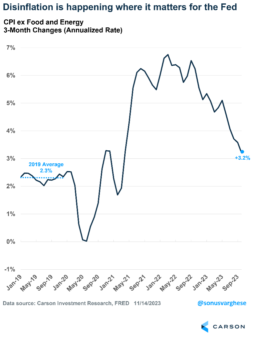 The Federal Reserve prefers to look at inflation stripped of food and energy, since these are volatile. Core inflation rose just 0.2% in October, translating to a 2.8% annualized pace. Over the last six months, core CPI has run at a 3.2% annualized pace — well below peak levels of 6-7% from a year ago — and is closing in on the Fed’s 2% target. Core CPI averaged about 2.3% before the pandemic.