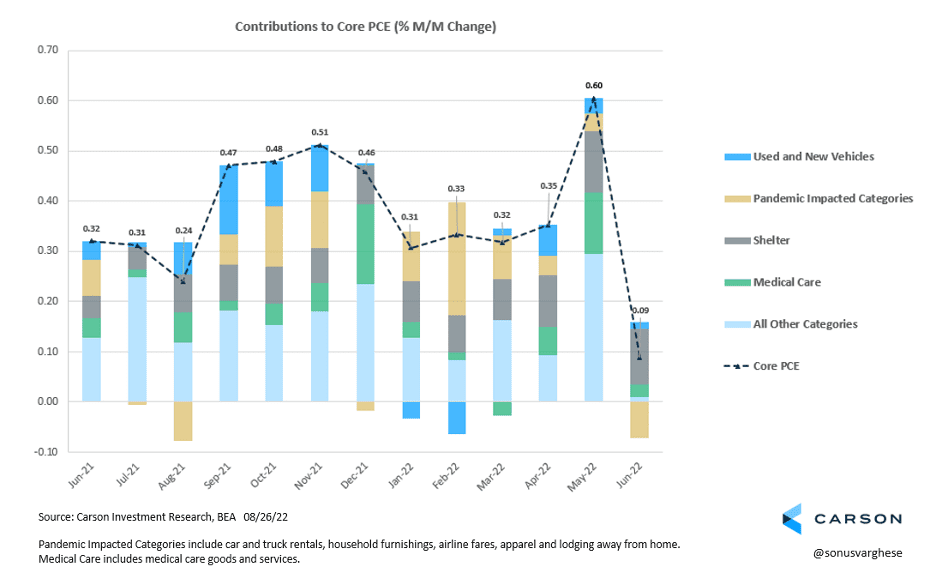 Last week the PCE price index report (the Fed’s preferred measure of inflation) showed prices falling 0.1% in July. Core PCE, which strips out more volatile food and energy prices, was also much lower than expected, rising just 0.1%. This is welcome news, but Powell was clear that one month of improvement is not enough. Inflation may continue to ease over the next few months, as pandemic-impacted services, such as airfares and hotel prices, and vehicle prices exert a deflationary force on inflation. If that happens, the question is how much softening would the Fed need to see before backing off its current path? Therein lies the uncertainty.