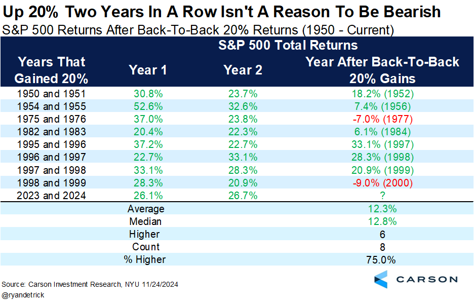 Many bears are back at it, claiming that because stocks are looking at back-to-back 20% gains 2025 must be doomed. Fortunately, all we have to do is look at the data to see they once again could be on the wrong end of this amazing bull market.