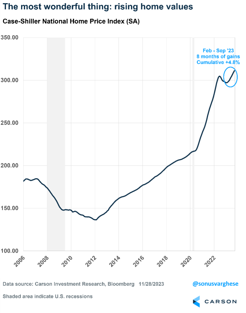 One, stocks have rallied recently. The S&P 500 climbed more than 15% since Oct. 27, which was when Carson’s chief market strategist, Ryan Detrick, called the bottom for this most recent downturn. This surge has led to the S&P 500 gaining almost 26% in 2023, including dividends. That’s cause for cheer by itself, but it’s even better considering that gain has entirely erased 2022’s losses.