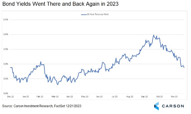 Nothing tells the story of the 2023 markets like yields, and the 10-year Treasury yield is a great reference point. We can read its movements in all the big stories of 2023: accelerating disinflation, an aggressive Fed, and a thriving U.S. economy, despite the skeptics.