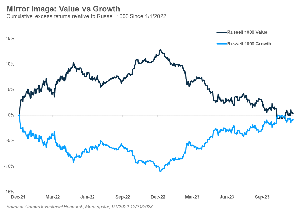 My chart of the year shows the returns of value and growth stocks relative to the broad Russell 1000, which encompasses both. Since the beginning of 2022, all the outperformance of value stocks has been washed away by the growth rebound in 2023. The game is tied 0-0, right back where we started! If these massive divergences don’t beg for a balanced investing approach with research-driven decisions around portfolio adjustments, I don’t know what does.