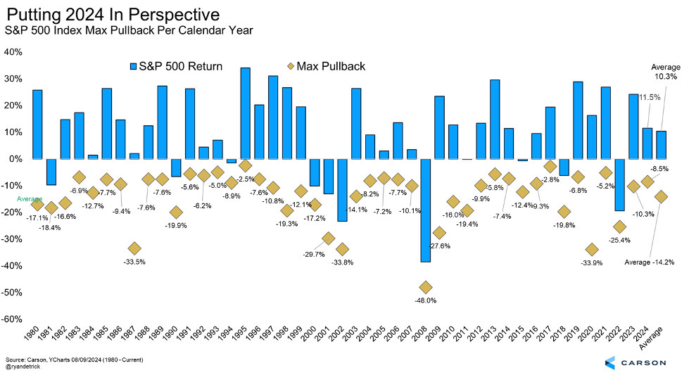 As scary as last week was, even the best years tend to see volatility and some scary headlines, so to think 2024 would be any different was probably foolish. Here’s a good chart showing that since 1980, the S&P 500 gained more than 10% per year on average, but has pulled back an average of 14.3% peak to trough intra-year as well. That puts the 11.5% rally and 8.5% pullback we’ve seen in 2024 in better perspective.