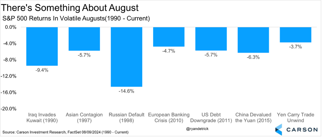 Yes, what we saw last week due to the yen carry trade unwinding wasn’t fun for investors, but it turns out August is the month we tend to see these types of out of the blue events more often than any other. So maybe this isn’t so odd?
