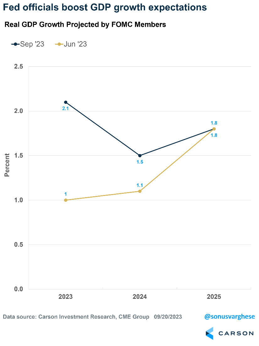 A stronger economy has resulted in the Fed moving its rate expectations quite a bit higher over the course of the year. Since last December, the Fed has moved the 2023 rate up from 5.1% to 5.6% and the 2024 rate up from 4.1% to 5.1%